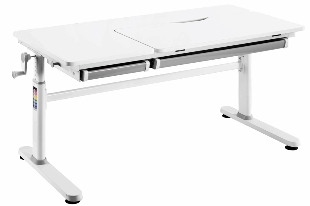 Ein vielseitiger, höhenverstellbarer Schreibtisch, ideal für Schularbeiten, Lesen und Bildschirmarbeit. Die manuelle Kurbelverstellung ermöglicht es Ihnen, den Schreibtisch einfach anzuheben oder abzusenken, wenn Ihr Kind wächst, was dazu beiträgt, eine gesunde Körperhaltung in verschiedenen Entwicklungsstadien aufrechtzuerhalten. Die geräumige Tischplatte von 120 x 60 cm bietet reichlich Platz für Bücher, Schreibwaren und Tablets.